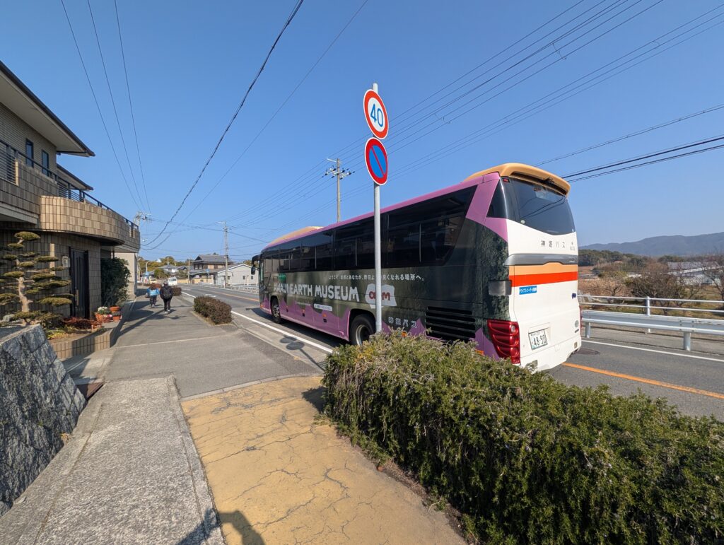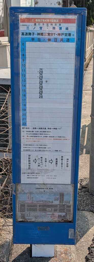 神社は公共交通機関で行こうとすると結構不便なケースがありますが、今回は電車で神戸の三宮まで行き、そこから神姫バスの高速バスに乗ると1時間半弱で伊弉諾神宮前に到着と、乗り換えが少なくバス停からの距離も近いため、日帰りで気軽に行くことができました。