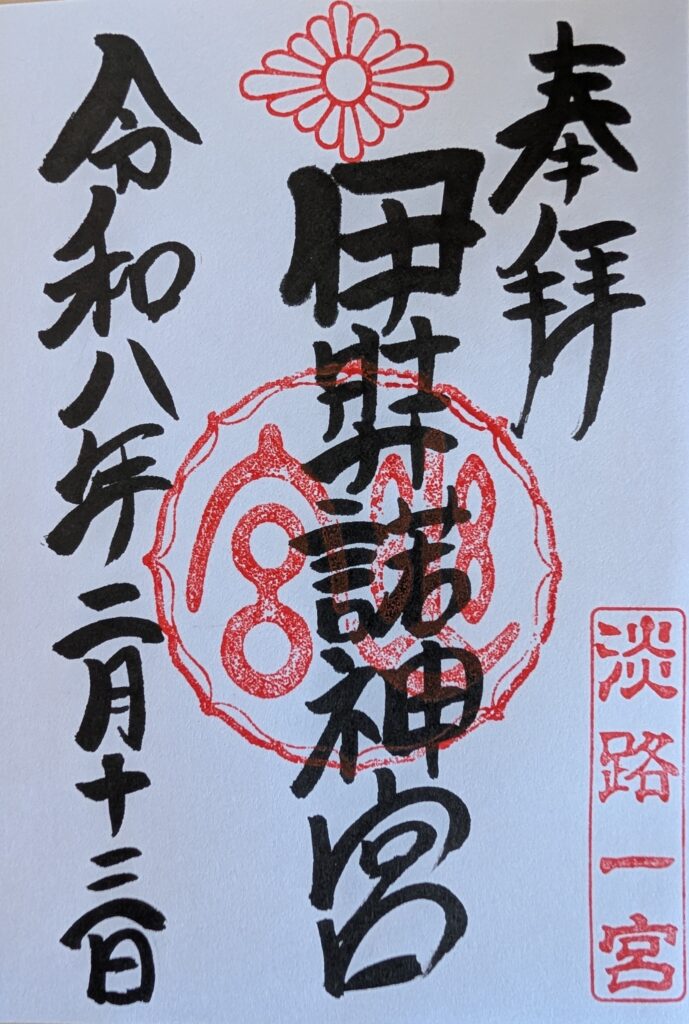 「淡路一宮」と菊の御紋が由緒を感じさせ、力強い筆致が素晴らしい御朱印でした。