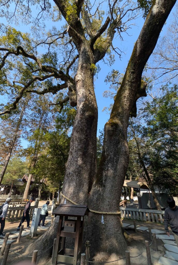 こちらは夫婦大楠(めおとのおおくす)です。元は二本の「楠(くすのき)」が根を合わせて一株に成長したもので、夫婦の正道の掟を定めた伊弉諾大神と伊弉冉大神を御祭神とする伊弉諾神宮に相応しいご神木だと思いました。