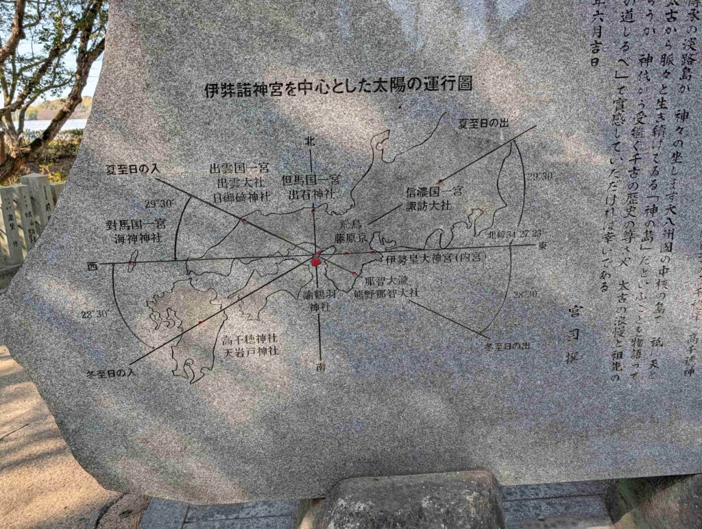 二つ目の鳥居をくぐると左手に「陽の道しるべ」がありました。これは、伊弉諾神宮を中心とする太陽の運行と有名神社の関係を現しているモニュメントで、位置関係がとても興味深いです。→公式HPリンク