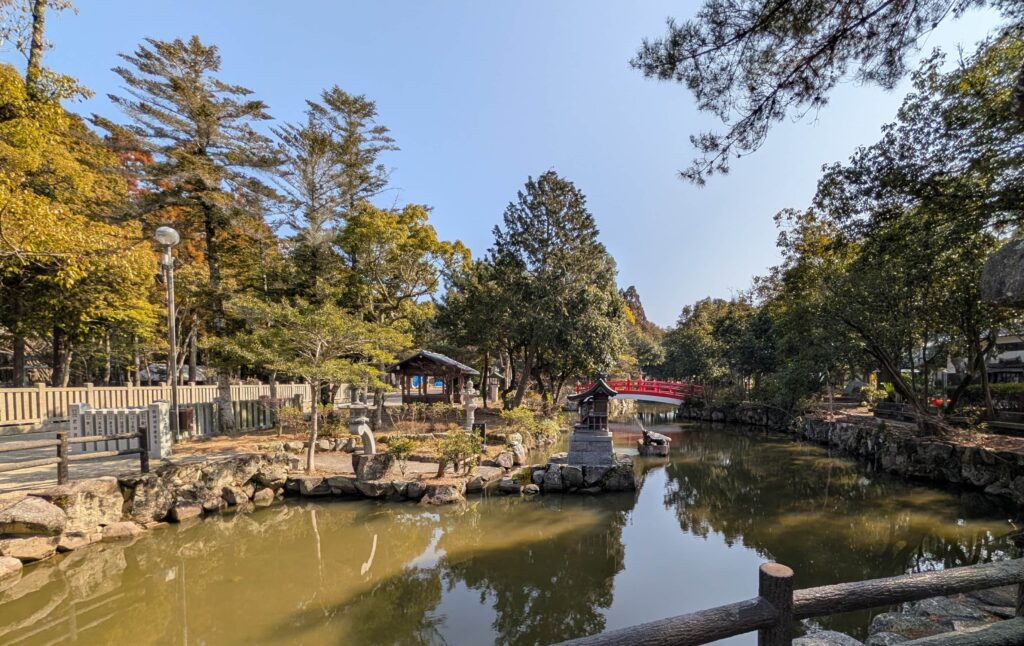 橋上から「放生も御池」が見渡せます。聖域の周濠の遺構といはれる神池で、緑に映える景観が美しかったです。