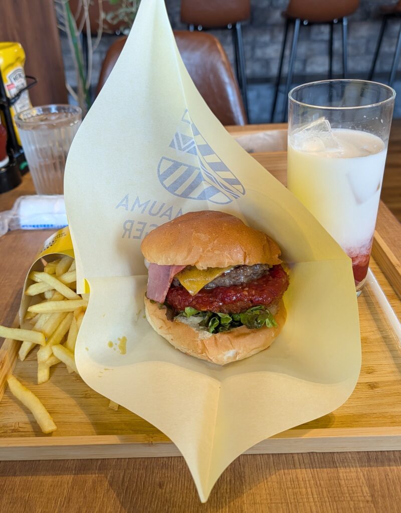 メニューは色々ありましたが、せっかく淡路島に来たので、淡路島プレミアムバーガーと淡路島牛乳の苺ミルクを頂きました。バーガーは淡路島特産の玉ねぎの大きなフライが淡路牛のパテとマッチして、美味しかったです。