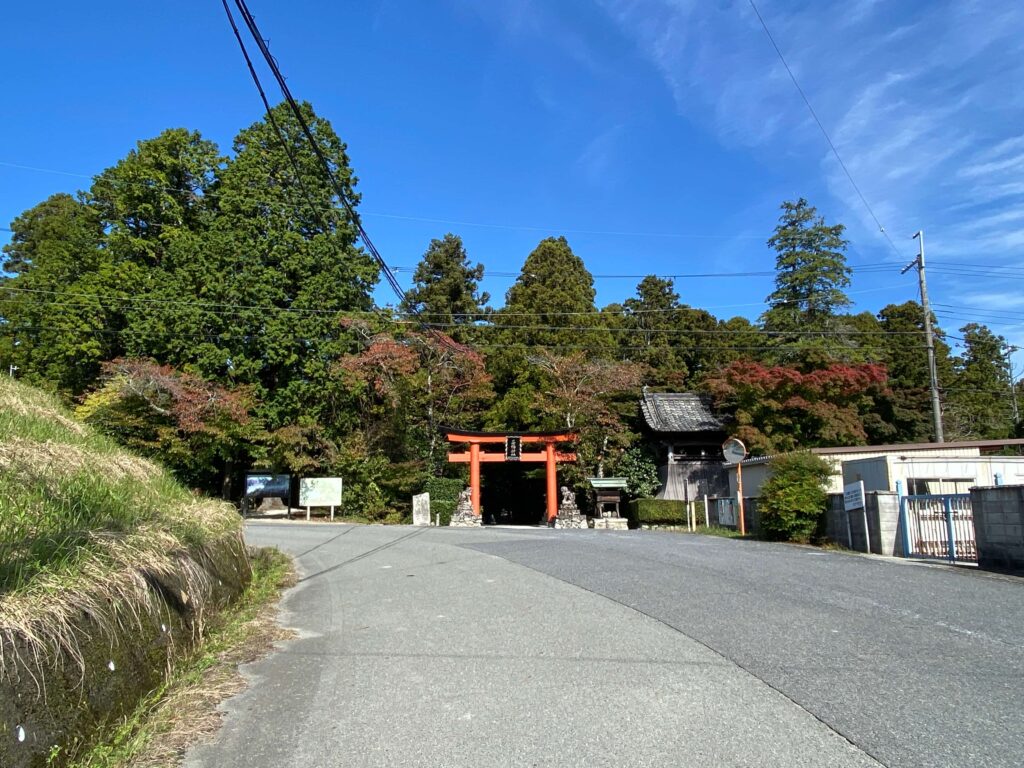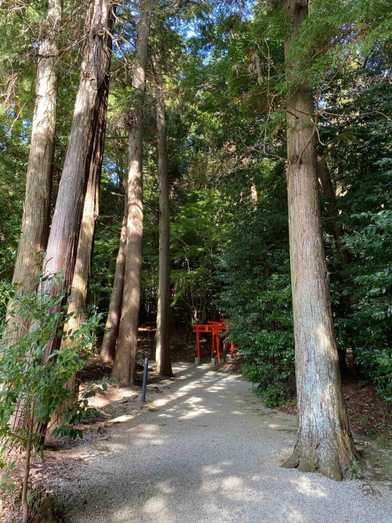 15分弱歩くと、見事に聳える木々の間に、高鴨神社の赤い鳥居が見えてきました。