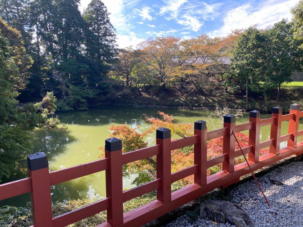 御朱印を頂いて、拝殿の左手の階段から降りる途中に、下に池が見えましたが、紅葉が始まったところでした。