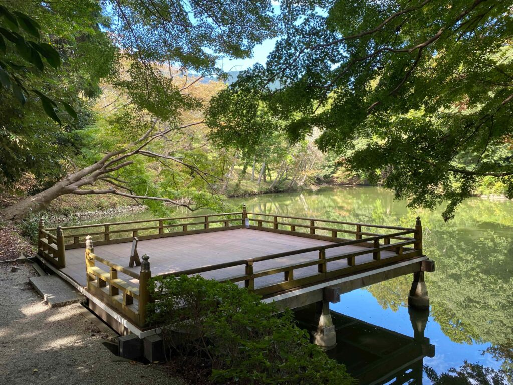 最後にこの舞台から池と拝殿を遠望して、高鴨神社の参拝を終了しました。