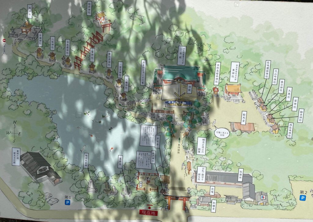 この鳥居の左手にわかりやすい案内図がありました。内部は結構シンプルで、鳥居をくぐって直進すれば拝殿に到着します。左右に摂社がありますが、左手の池沿いの道は風情がありました。