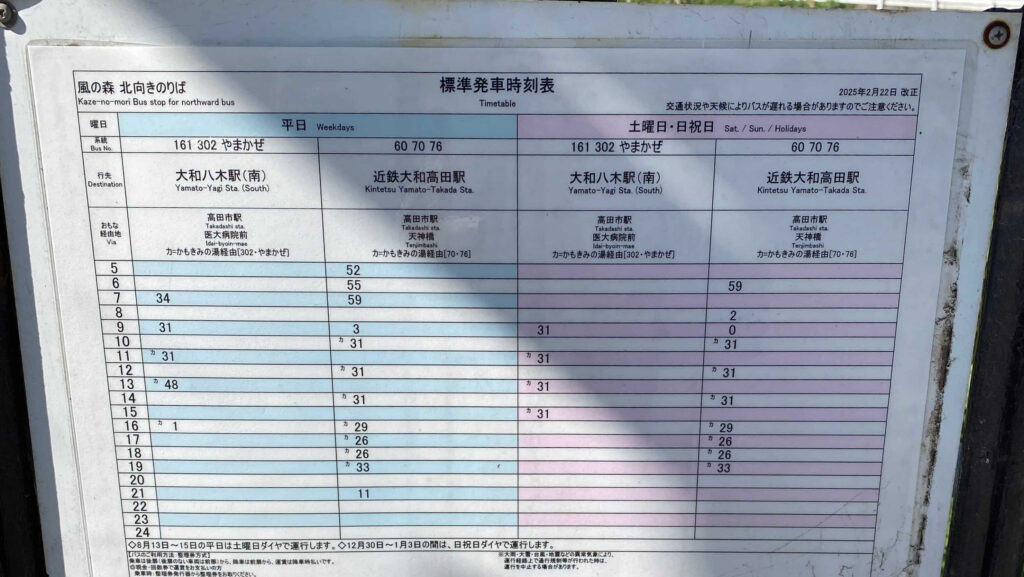 今回は、冒頭に記載の通り、近鉄、JRを乗り継いで、奈良交通バスの「住川」という停留所から奈良交通バスに乗り、「風の森」バス停で下車しました。以下の時刻表の通りバスの本数が1~2時間に1本と少ないので、帰りのバスの時刻も確認して、それに合わせて行動することをお勧めします。